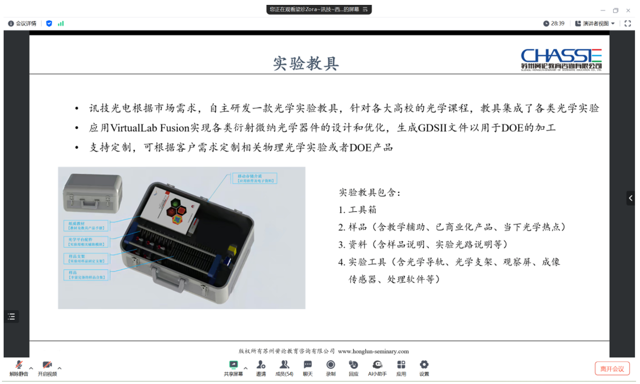 隨后,工程師詳細(xì)介紹了訊技自研的光學(xué)實(shí)驗(yàn)教具與VirtualLab Fusion軟件。訊技自研的光學(xué)實(shí)驗(yàn)教具是公司根據(jù)市場(chǎng)需求,精心研發(fā)的成果,它緊密結(jié)合教學(xué)與科研需求,針對(duì)各大高校的光學(xué)課程,集成了各類光學(xué)實(shí)驗(yàn),能夠幫助學(xué)生和科研人員更好地理解光學(xué)原理,提升實(shí)踐能力。