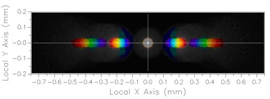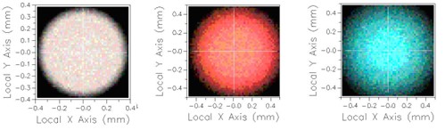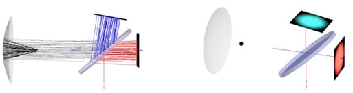 寬光譜光源對許多光學(xué)系統(tǒng)都很重要,應(yīng)用范圍包括白光照明、分光計等。FRED中的顏色圖像分析,是通過計算每個像素的色度坐標(biāo)并在表面上顯示生成的RGB值來生成顏色分布。此外,F(xiàn)RED還可以顯示彩色色度圖,并在用戶移動光標(biāo)時指示每個像素的色度坐標(biāo)。在本案例中,將觀察兩個光學(xué)系統(tǒng)的彩色圖像。第一個系統(tǒng)包括一個分色的“冷光鏡”,將白光分為兩個波長段。第二個系統(tǒng)利用線偏振器和波片來顯示雙折射材料的波長依賴性。