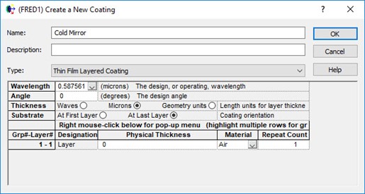 FRED中可以指定幾種膜層類型,例如采樣膜層,薄膜膜系,四分之一波長單層膜層,一般采樣膜層(入射角,波長和偏振相關(guān)),偏振片/波片膜層(瓊斯矩陣) 和腳本膜層。 在此案例中,使用Thin Film Layered Coating類型(圖1)創(chuàng)建冷鏡。