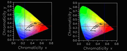 圖5. 圖中十字線表示的光束反射(左)和透射(右)分量的平均色度坐標(biāo)。通過將分析面減少到一個像素并評估其彩色圖像來確定該值。