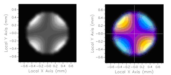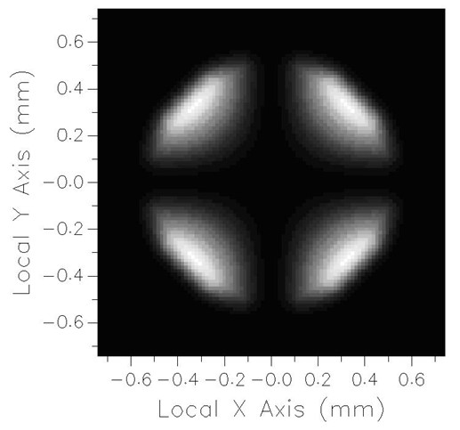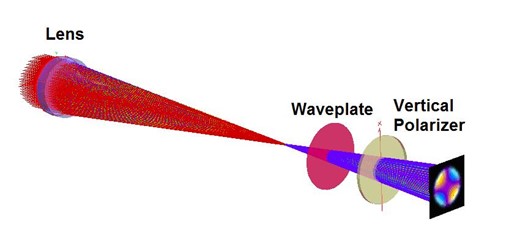 在該系統(tǒng)中,相干的水平偏振白光由透鏡聚焦。波片放置在焦點之外,然后是垂直線偏振片(圖6)。準(zhǔn)直的水平偏振光不通過偏振片,然而,水平偏振光線的擴展光束在每個角落處具有一些通過的垂直偏振分量。圖7顯示了沒有波片系統(tǒng)的輻照度。