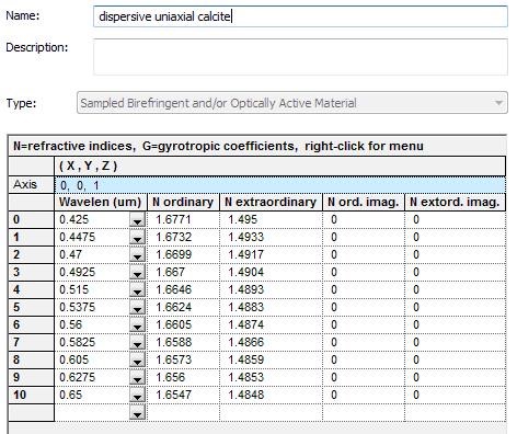 接下來,添加波片(0.00304 mm厚的由雙折射方解石制成)。方解石材料是使用FRED的Sampled Birefringent and/or Optically Active Material材料類型創(chuàng)建的。方解石的規(guī)格如圖8所示。