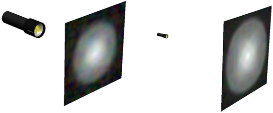 在不同距離處對手電筒的輻照度、強度和彩色圖進行分析(圖3)。通過調整拋物面反射鏡的形狀可以優(yōu)化發(fā)射光的準直性。