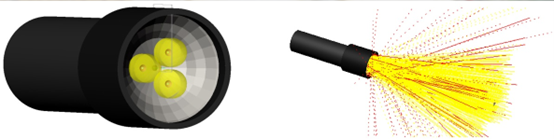 圖1 左:FRED中的手電筒模型。該模型由筒身、多面反射鏡和排列的三個白光LED組成。右:手電筒光線軌跡示意圖。由面反射鏡反射的光線顯示為紅色。