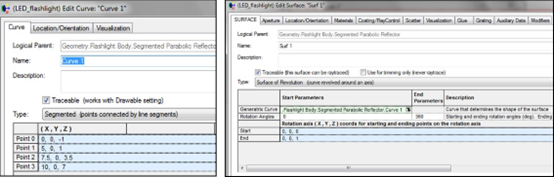 為了提高光學效率,面反射鏡恰好可以放置在LED后面。使用“自定義元件”可以創(chuàng)建該反射鏡,自定義元件由兩部分組成:一條曲線和一個表面。分段曲線需要每個間斷點的(X,Y,Z)坐標,用于定義反射鏡的徑向分布。該曲線在X-Z平面具有拋物線形狀,Z值正比于X^2。然后將分段曲線指定為旋轉曲面的母線。分段反射鏡曲線和表面的準確參數(shù)如圖2所示,以及已完成的反射鏡的示意圖。