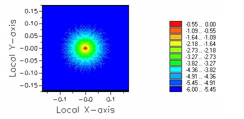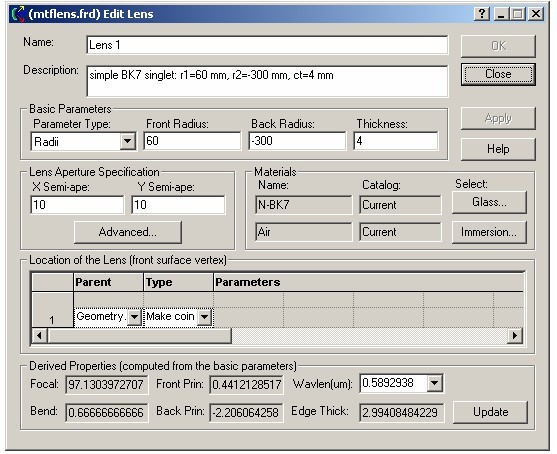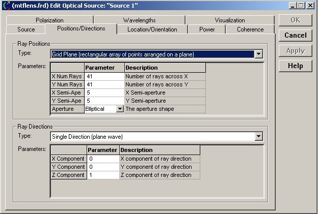 這篇文章中我們所使用的系統(tǒng)是一個簡單的透鏡,將光聚集到附著在幾何面的分析面上。透鏡是一個簡單的雙凸BK7單透鏡,參數(shù)為r1=60 mm, r2=-300 mm, ct=4 mm, x semi-aperture=10, y semi-aperture=10,該透鏡的像平面位于近軸焦點處。