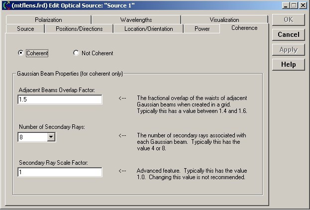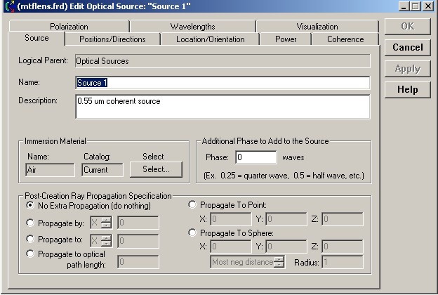 光源是一個44*44格的相干光,類型是single direction(plane wave)單一方向的平面波,波長為0.55 μm,功率為一個單位。