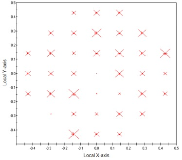 其中L=桿長,λ是以系統(tǒng)單位表示的光波長,K是一個(gè)整數(shù),no和ne是雙折射率的尋常和非尋常分量。通過這個(gè)塊狀雙折射材料的光線追跡會(huì)將每個(gè)光線分成尋常和非尋常分量。作為分析結(jié)果,偏振點(diǎn)圖(Polarization Spot Diagram)將會(huì)顯示每個(gè)單獨(dú)的分量(圖2)。