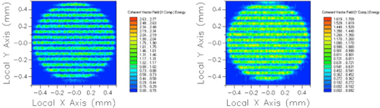 圖3.x偏振光通過具有+45°光軸的楔形方解石晶體后,探測器上相干矢量場的x和y分量。波片厚度沿著y方向變化,因此在沿著楔形周期性位置處擔(dān)當(dāng)著1/2波片的角色。