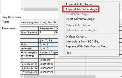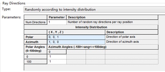 光線的空間位置指定好了后,我們需要輸入光線的方向信息。規(guī)格表為光源提供了強(qiáng)度數(shù)據(jù),因此使用光線方向說明“Randomly according to intensity distribution”才是有意義的。該光線方向說明將會(huì)在球形極坐標(biāo)網(wǎng)格上獲取強(qiáng)度分布,并且根據(jù)該分布輪廓統(tǒng)計(jì)隨機(jī)的光線方向(比如:強(qiáng)度最高的地方產(chǎn)生更多的光線,強(qiáng)度低的方向光線較少)。