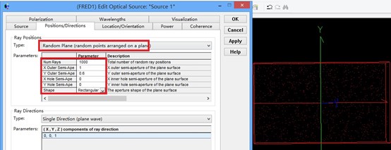 假設(shè)光源出口孔徑的大小是2mm×1.2mm(W×H),首先鼠標(biāo)右鍵單擊光源文件夾,從列表清單里選擇“創(chuàng)建新的詳細(xì)光源”。在光源對(duì)話框的位置/方向標(biāo)簽上選擇“隨機(jī)平面(平面上排列著隨機(jī)點(diǎn))”,并根據(jù)上述的規(guī)格表設(shè)置X和Y的外半孔徑值。開始后,設(shè)置光線數(shù)目為1000,孔徑的形狀為矩形。