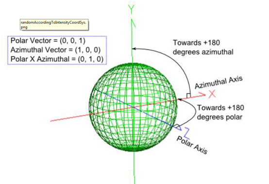 強(qiáng)度分布的插值取決于極化和方位角方向向量的規(guī)格說明。極坐標(biāo)角開始于極軸并朝方位角軸正向增加。方位角開始于方位角軸,延伸到與極化和方位角方向矢量定義平面相垂直的面。極矢量和方位角矢量的叉乘確定了方位角的正向方向。極矢量(0,0,1)和方位角矢量(1,0,0)的例子如下圖所示。
