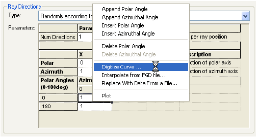 為了從極坐標(biāo)圖中數(shù)字化取樣數(shù)據(jù)到光線方向規(guī)格表中,我們可以在電子表格區(qū)域右鍵點(diǎn)擊鼠標(biāo),在列表菜單里選擇“數(shù)字化曲線”。