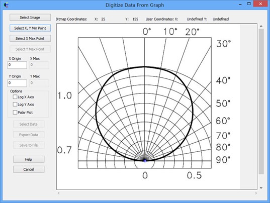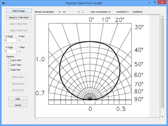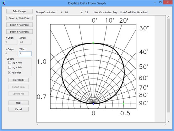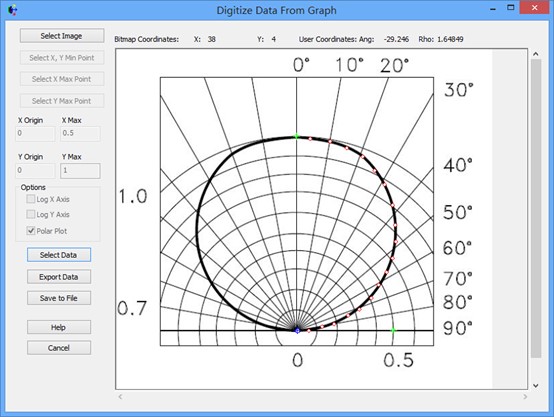 在數(shù)字化工具對(duì)話框中使用“選擇圖像”按鈕,從規(guī)格表中選擇一個(gè)極坐標(biāo)圖的圖像文件。FRED數(shù)字化工具允許的圖像文件格式是*.bmp, *.pcx, *.jpg, *.tga, and *.tif。