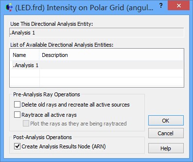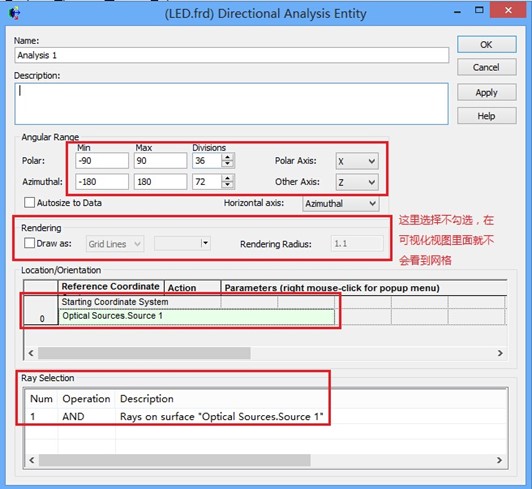接下來,通過點(diǎn)擊菜單>光線追跡>創(chuàng)建所有源光線選項(xiàng),創(chuàng)建源光線(不要追跡)。創(chuàng)建好源光線后,通過點(diǎn)擊菜單>分析>極坐標(biāo)網(wǎng)格強(qiáng)度選項(xiàng),選擇賦予到光源模型中DAE中,并選中“Create Analysis Results Node”。