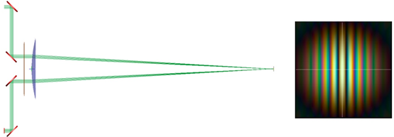 嵌入式腳本可以用于產(chǎn)生具有合適波長和角距的光源,來代表恒星對(duì)象。實(shí)現(xiàn)這個(gè)目的的一種方法是產(chǎn)生一對(duì)相干的平面波光源:一個(gè)光源就位于M1之前,另一個(gè)就位于M2之前。每個(gè)光源都有基于光源光譜的合適的波長和相對(duì)功率,并且在提供的角度直徑內(nèi)的任意方向傳播。一旦所有的光源創(chuàng)建好,相干光線追跡就會(huì)執(zhí)行。在探測(cè)器平面上的輻照度和彩色圖會(huì)得到計(jì)算并顯示出來。為了模擬邁克爾遜恒星干涉儀的運(yùn)行,額外的循環(huán)可以添加到腳本中,它會(huì)在每一步掃描反射鏡間距并計(jì)算條紋可見度。條紋可見度的第一個(gè)極小值會(huì)出現(xiàn)在d=λ0/(2θ)處,其中λ0是恒星(發(fā)光)的中心波長,θ是以度為單位的角距。
