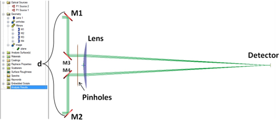 系統(tǒng)的幾何結(jié)構(gòu)如圖1所示。干涉儀由四個(gè)反射鏡、一對(duì)小孔、一個(gè)正透鏡和一個(gè)探測(cè)儀組成。