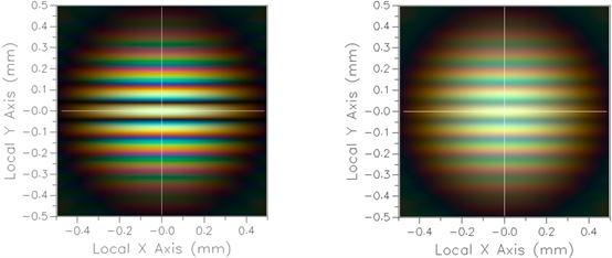 圖2.左:角度范圍為1弧秒的恒星在探測(cè)器上的白光干涉圖樣,白光的中心波長為0.55um,半帶寬為0.1um。干涉儀的小孔半徑為1mm,反射鏡距離為50mm。右:增加反射鏡間距到100mm的干涉圖樣,此干涉圖的能見度降低了。
