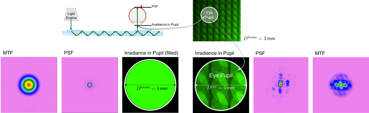 一些復(fù)雜的物理效應(yīng)只是在A(yíng)R/MR波導(dǎo)中耦合在一起影響器件最終性能的幾個(gè)復(fù)雜物理現(xiàn)象的例子,例如重疊光束之間的干涉及其如何影響eye-box均勻性,所采用光源的相干特性,進(jìn)入系統(tǒng)的光的初始偏振態(tài)與系統(tǒng)中不同組件引入的矢量效應(yīng)之間的糾纏,或者衍射對(duì)器件包括人眼的點(diǎn)擴(kuò)散函數(shù)/調(diào)制傳遞函數(shù)的影響。