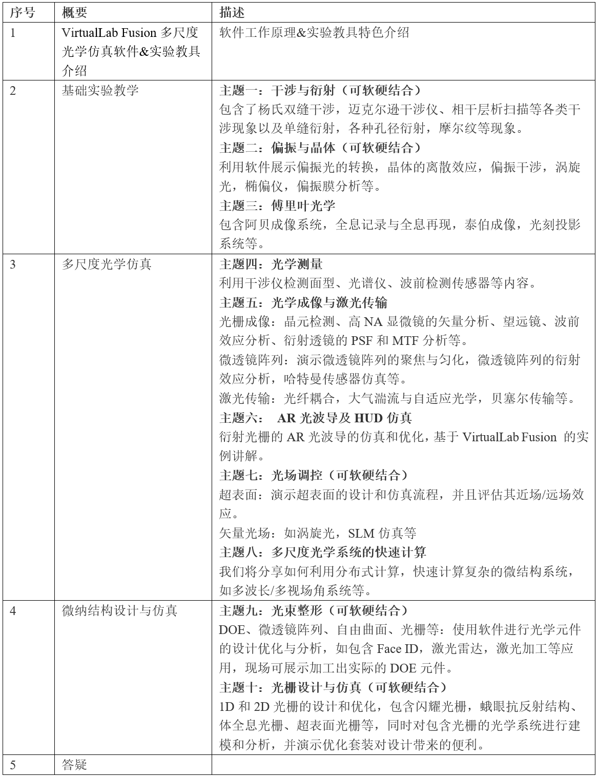 共享光學(xué),智啟未來(lái)。多尺度光學(xué)仿真軟件VirtualLab Fusion作為虛擬實(shí)踐平臺(tái),重現(xiàn)了經(jīng)典物理光學(xué)中的重要原理和現(xiàn)象,比如狹縫衍射以及泊松亮斑實(shí)驗(yàn)、邁克爾遜干涉以及楊氏雙縫干涉實(shí)驗(yàn)等。2025年我們將繼續(xù)在全國(guó)開(kāi)展VirtualLab Fusion多尺度光學(xué)仿真與實(shí)驗(yàn)搭建全國(guó)巡講活動(dòng),本次活動(dòng)對(duì)象擴(kuò)展到更多高校、研究所與公司,我們將安排不同的主題活動(dòng),結(jié)合訊技光電自主研發(fā)合作的光學(xué)實(shí)驗(yàn)教具,通過(guò)軟件、硬件虛實(shí)結(jié)合展示的直觀生動(dòng)方式,以滿足高校、研究所與公司的不同光學(xué)技術(shù)交流需求。“星光百點(diǎn),共享光學(xué)”正在火熱征集中,我們正在尋找志同道合的光學(xué)人—VirtualLab Fusion多尺度光學(xué)仿真與實(shí)驗(yàn)搭建全國(guó)巡講活動(dòng)開(kāi)始啦!