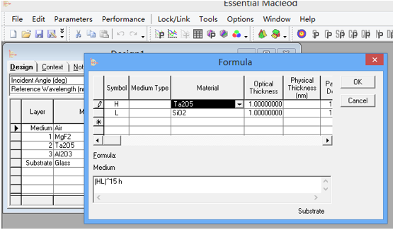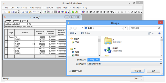 該系統(tǒng)如圖1-1所示。將該系統(tǒng)輸入到一個(gè)堆棧文件中,我們首先要說(shuō)明它有三層介質(zhì),入射介質(zhì)是空氣,緊接著是玻璃介質(zhì),最后的出射介質(zhì)也是空氣。在玻璃介質(zhì)的前表面鍍膜1。雖然實(shí)際上,膜2是鍍?cè)诓AЫ橘|(zhì)的后表面,但在導(dǎo)入堆棧中時(shí)我們將膜2視為鍍?cè)诳諝獬錾浣橘|(zhì)的前表面。這意味著在該例子中,第二膜層設(shè)計(jì)時(shí)假定入射介質(zhì)是玻璃,出射介質(zhì)和基底是空氣。這顯然是不對(duì)的,因?yàn)樵O(shè)計(jì)文件中要求入射介質(zhì)是空氣,基底是玻璃。為了糾正這一點(diǎn),我們要確定膜層方向(Coating Direction)輸入的是反向(Reversed),實(shí)際上,堆棧文件通常會(huì)自動(dòng)處理。