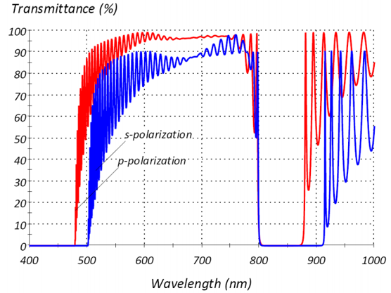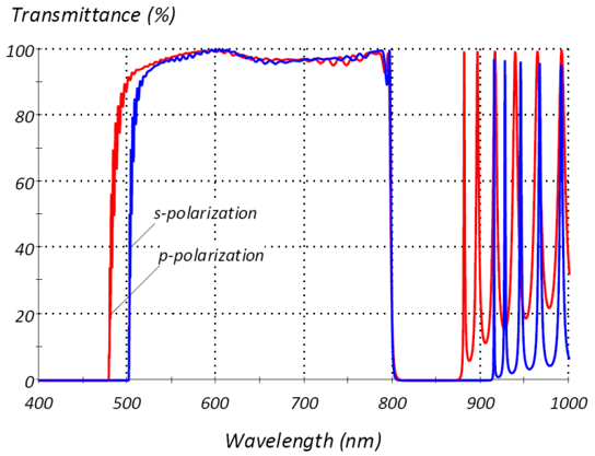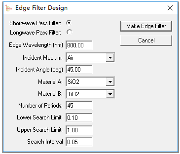 Design Tool中,EdgeFilter的功能是可以用來(lái)幫助設(shè)計(jì)邊緣濾波器的結(jié)構(gòu)。一個(gè)簡(jiǎn)單的邊緣濾波器是基于四分之一堆棧的,在基板和入射介質(zhì)旁邊的幾個(gè)匹配層可以用來(lái)抑制通帶波紋。當(dāng)傾斜時(shí),高反射率區(qū)的寬度對(duì)S偏振光有增大的趨勢(shì),對(duì)P偏振光有減小的趨勢(shì),導(dǎo)致偏振分離。四分之一波長(zhǎng)堆棧不容易得到顯著改善,但是Thelen 已經(jīng)表明五層對(duì)稱周期是可以作為邊緣濾波器的基礎(chǔ)的,其中p和s偏振邊緣可以重合。嚴(yán)格來(lái)說(shuō),這只是在一個(gè)入射角,但經(jīng)驗(yàn)表明,在一定角度范圍內(nèi)分裂非常小。邊緣濾波器工具可以找到這樣一個(gè)對(duì)稱的周期,并設(shè)計(jì)一個(gè)非偏振邊緣濾波器。該工具使用迭代技術(shù)來(lái)識(shí)別所有可能的組合,并找到通帶寬度和禁帶寬度的最佳組合,但是后者受到一定限制。