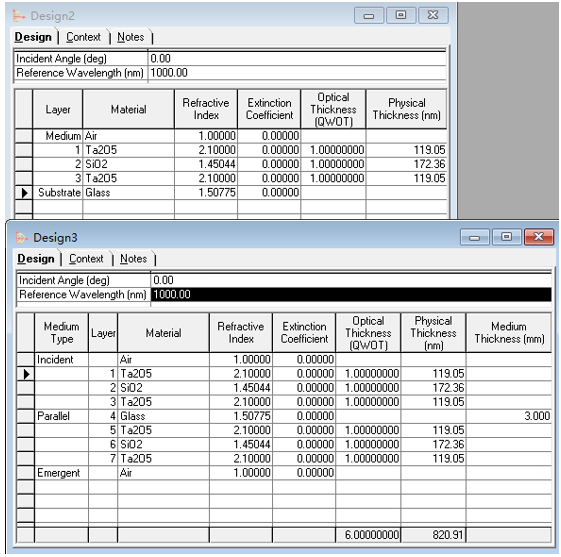 圖2.原始設(shè)計(jì)文檔(上部)通過(guò)勾選Display Setup對(duì)話框中的Medium條目添加了Medium Type和Medium Thickness列。然后將3毫米厚平行基板與背面膜層一起添加,最后將出射介質(zhì)設(shè)置為空氣。