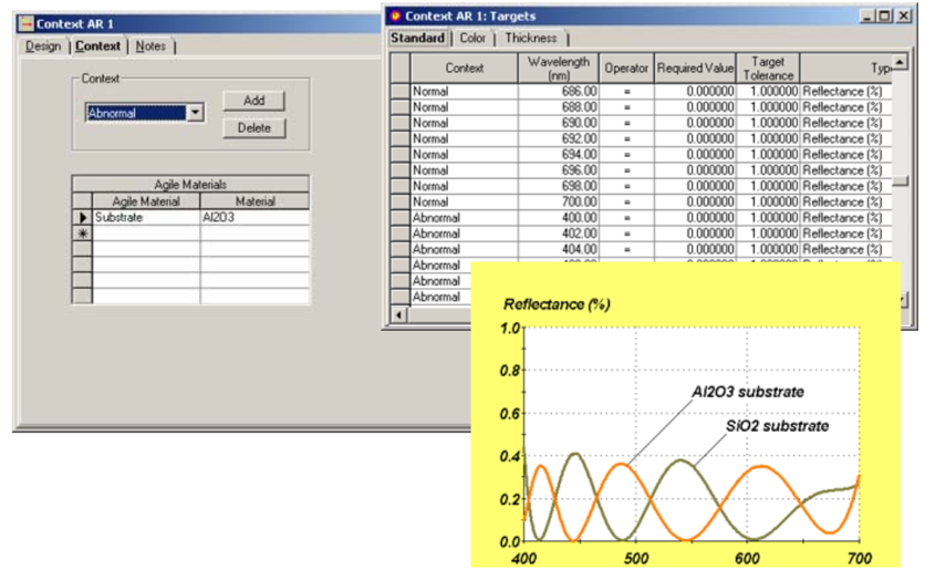 圖2.使用Context屬性的示例。在設計文件的Context中,標簽基板被聲明為一種敏感材料,在Normal Context中具有材料SiO2的特性,在新添加的Context中具有Al2O3的特性-Abnormal。在normal和abnormal情況下,目標被設置為從400nm到700nm的零反射率,圖中顯示了使用材料MgF2和Ta2O5進行優(yōu)化合成的結果。