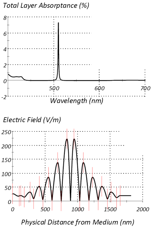 圖1顯示了使用具有無吸收低折射率材料(SiO2)和輕微吸收的高折射率材料(TiO2)薄膜的窄帶濾光片的一些結(jié)果。電場分布的平方很好地解釋了吸收率變化。勢吸收率幾乎相同,因為反射率為零,但膜層前面部分的吸收降低了墳?zāi)股系腎enter的值,因此膜層后部的吸收率逐漸增加。