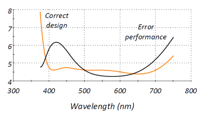 圖1.橙色曲線表示無誤差四層設計的性能,黑色曲線表示有誤差的性能。這兩條曲線都包括基板后表面的影響。