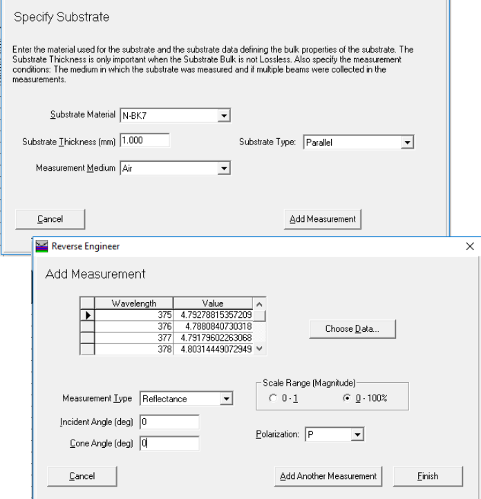 圖3.反演工程中的第二個和第三個對話框,我們在其中輸入基板細節(jié),然后輸入測量的性能。性能可以是反射率、透射率或橢圓參數(shù)。