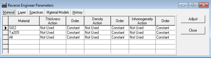 圖6.Agjust菜單是我們使用參數(shù)對話框啟動和控制流程的地方。選項卡顯示我們可以改變的參數(shù)。Material選項卡允許所選材質的所有層的變化。變化率可以是一個常數(shù),可以顯示,也可以在整個設計過程中線性或四次變化,這是在Order列中定義的。這基本上是工具因子的影響。