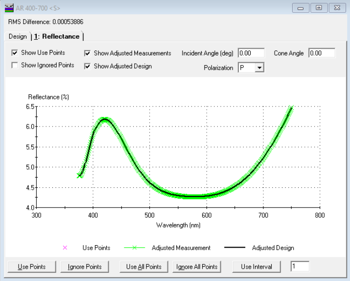 圖4.輸入性能后,顯示屏將顯示測量的性能以及從正確設計中計算得出的性能。有各種可用的命令,可以減少目標點的數(shù)量、阻止某些目標區(qū)域等