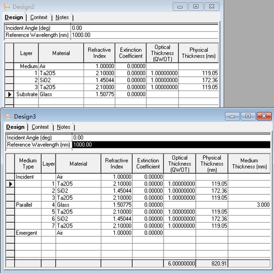 圖2.原始設(shè)計(jì)文檔(上部)通過(guò)勾選Display Setup對(duì)話框中的Medium條目添加了Medium Type和Medium Thickness列。然后將3毫米厚平行基板與背面膜層一起添加,最后將出射介質(zhì)設(shè)置為空氣。
