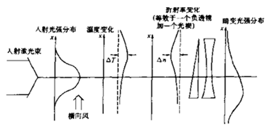 激光在大氣中傳輸時部分能量被空氣中的分子和氣溶膠吸收。被吸收的熱量將空氣加熱,導(dǎo)致氣壓上升,空氣膨脹,空氣密度降低,折射率下降,形成一個負透鏡,使激光束發(fā)散。當(dāng)存在側(cè)向風(fēng)時,下風(fēng)區(qū)空氣密度降低,因而下風(fēng)區(qū)的折射率減小,形成特有的彎向上風(fēng)區(qū)的光束分布,使光束畸變、彎曲和發(fā)散,劣化光束質(zhì)量。這就是熱暈效應(yīng)。它是激光在大氣中傳輸時所面臨的嚴(yán)重問題之一。
