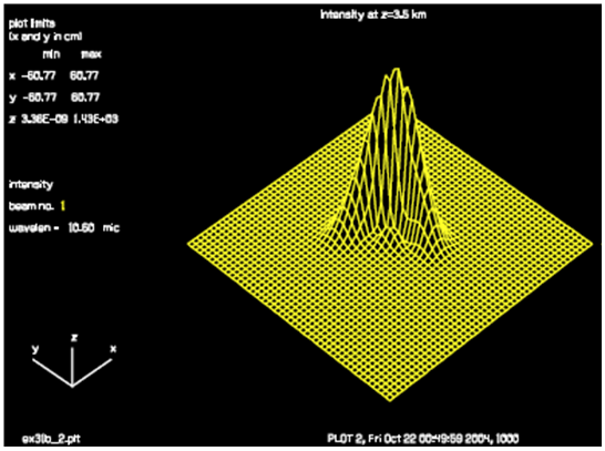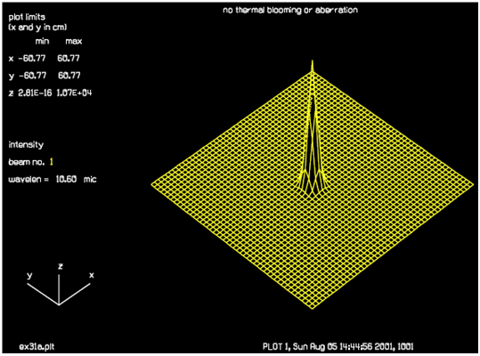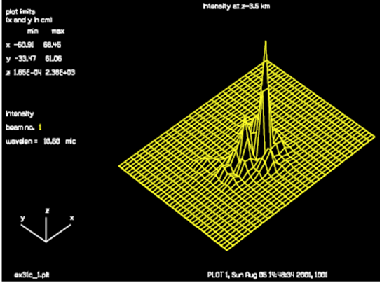圖1.不含大氣像差和熱暈效應(yīng)的遠場分布,此時光束的焦點在4km處,光斑尖銳。