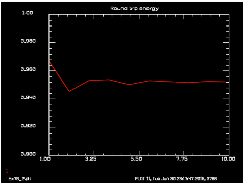 本例重點(diǎn)展示了resonator以及optimization兩個(gè)命令的使用。通過調(diào)整諧振腔兩端腔鏡的曲率半徑設(shè)計(jì)出光束束腰為0.04cm的諧振腔。初始狀態(tài)時(shí)兩個(gè)腔鏡的曲率半徑是一樣的,因此諧振腔初始狀態(tài)是一個(gè)對(duì)稱腔。“resonator/test”對(duì)建立的諧振腔進(jìn)行測(cè)試,并計(jì)算ABCD傳輸特性,從而計(jì)算出初始本征模,并將其存儲(chǔ)起來供optimization命令調(diào)用優(yōu)化。