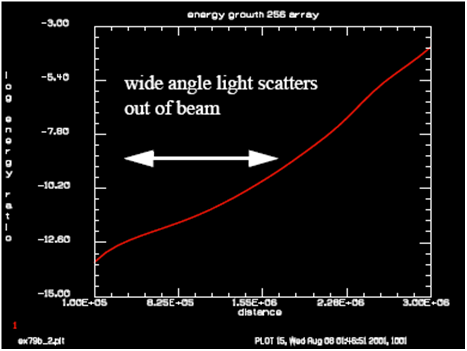 沒有受激拉曼放大下的自發(fā)輻射開始會線性增長,但是隨著傳播距離的增加,就會有越來越多的空間分量散射出主光路,最終自發(fā)輻射到達一個穩(wěn)定值。越大的采樣陣列能夠涵蓋的自發(fā)輻射角度越大,但同時散射效應作用的距離也更短。