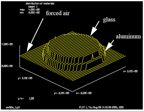 本例介紹了一個玻璃窗口被一個金屬鋁環(huán)包圍,并通過壓縮空氣對其進行降溫。“thermal/material/add”命令可以將三種材料的熱分布整合在一個數(shù)據(jù)矩陣中。GLAD通過特定材料的名稱在MATLIB中實現(xiàn)對各種材料的調(diào)用。在每個熱區(qū)域,一共可以定義4種材料。光學(xué)材料中,虛部包含了內(nèi)部的熱源分布。流體中,虛部包含了傳導(dǎo)常數(shù)分布。