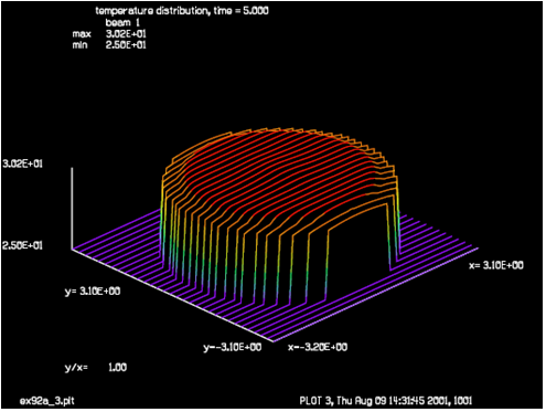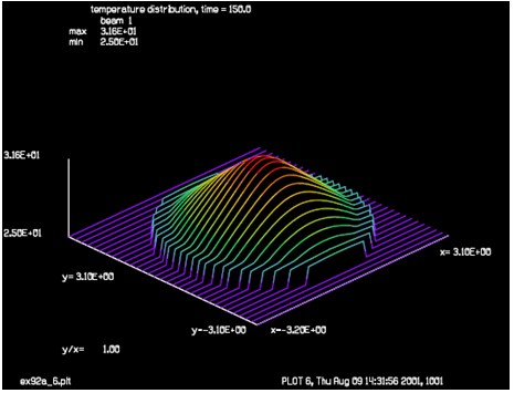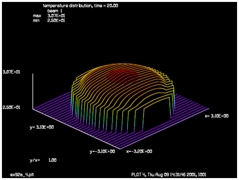 初始狀態(tài)時玻璃窗口和圓環(huán)的溫度為30度,壓縮空氣為25度,并通過“thermal/settle”命令實現(xiàn)了熱傳導(dǎo)和熱對流。壓縮空氣向內(nèi)流動對窗口冷卻,內(nèi)部熱源在窗口的中心位置開始發(fā)出熱量。對于相距0.1cm的兩個陣列點,材料的熱時間常數(shù)分別為:玻璃,2秒;鋁,0.0043秒;壓縮空氣,12.2秒。鋁的熱導(dǎo)率非常高,熱量不斷地向空氣中擴散。在5秒時,內(nèi)部熱源的影響幾乎觀察不到,但是在20秒時已經(jīng)非常的明顯了。當(dāng)時間達(dá)到150秒時內(nèi)部熱源的加熱與壓縮空氣的冷卻達(dá)到了一個穩(wěn)定平衡的狀態(tài)。