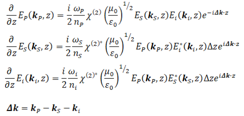 光學(xué)參量放大(OPA)涉及三波轉(zhuǎn)換過程、單軸晶體中的雙折射現(xiàn)象、k矢量的相互作用以及色散效應(yīng)等。OPA的基本方程是用來描述泵浦光Ep,信號(hào)光Es以及閑頻光Ei之間相互作用的方程組:
