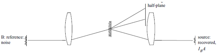 圖1是加密過程示意圖,在遠場區(qū)兩束光相干涉得到干涉圖樣,對于一個復(fù)雜的隨機參考光源,任意選擇一個物光源全息圖樣都會非常的復(fù)雜。僅僅依靠全息圖是很難確定物光源的,只有使用同一個隨機光源才能對其恢復(fù),圖2給出了解密過程示意圖。通過遮擋板將恢復(fù)出的部分分量遮擋就可以濾除不必要的成分,如圖3所示。