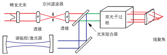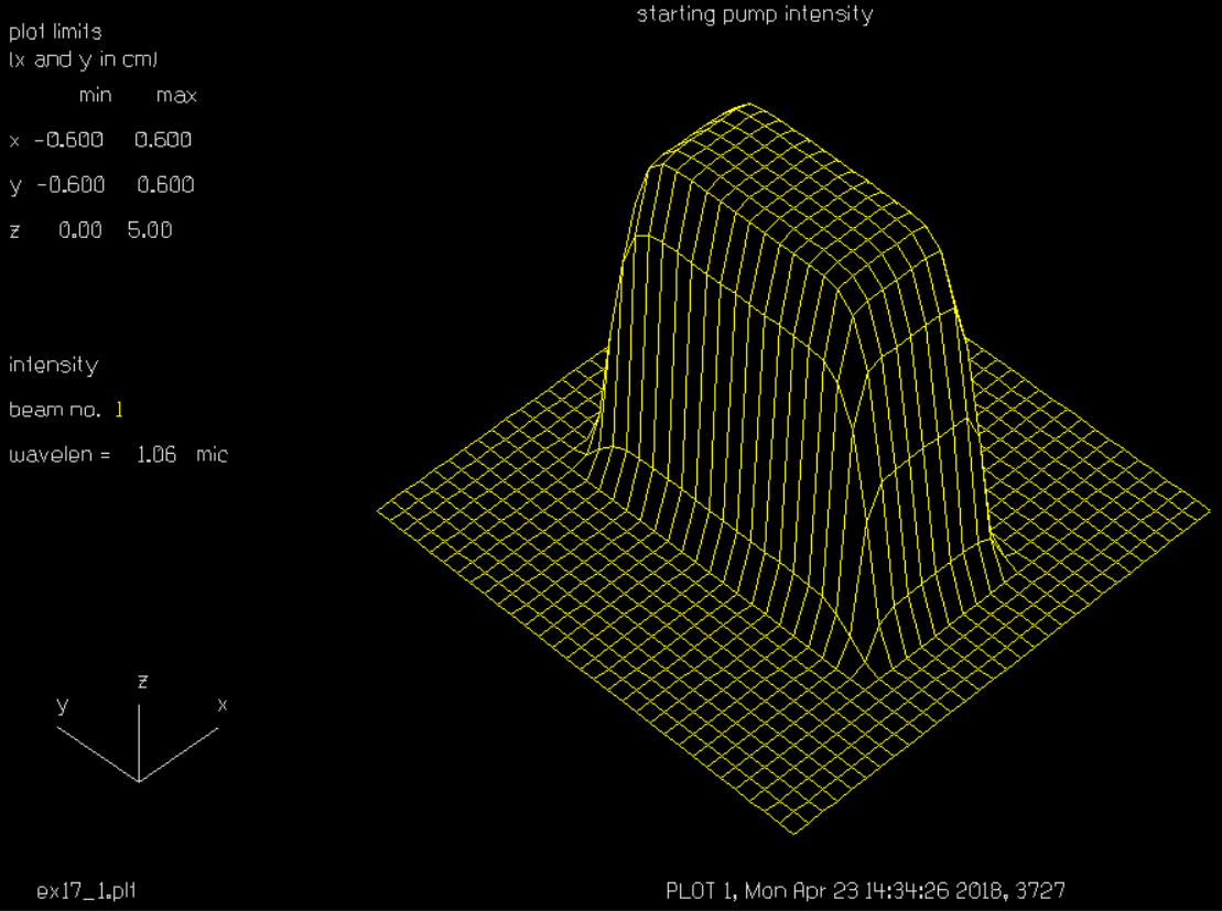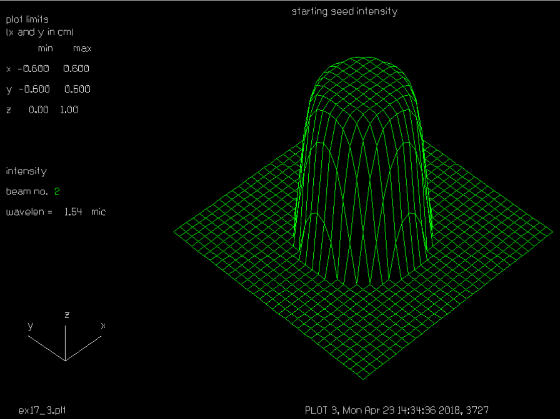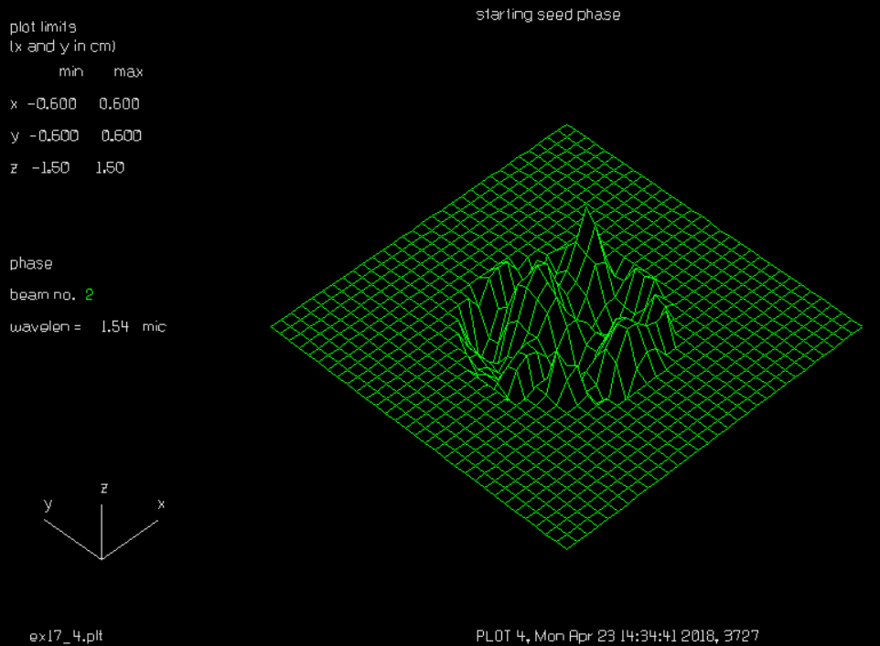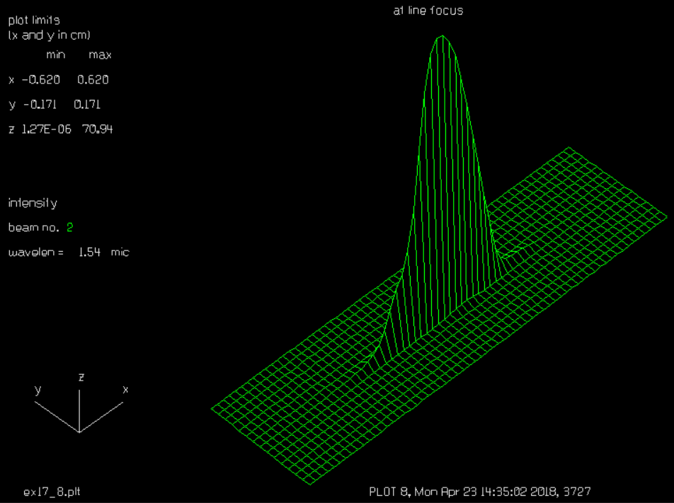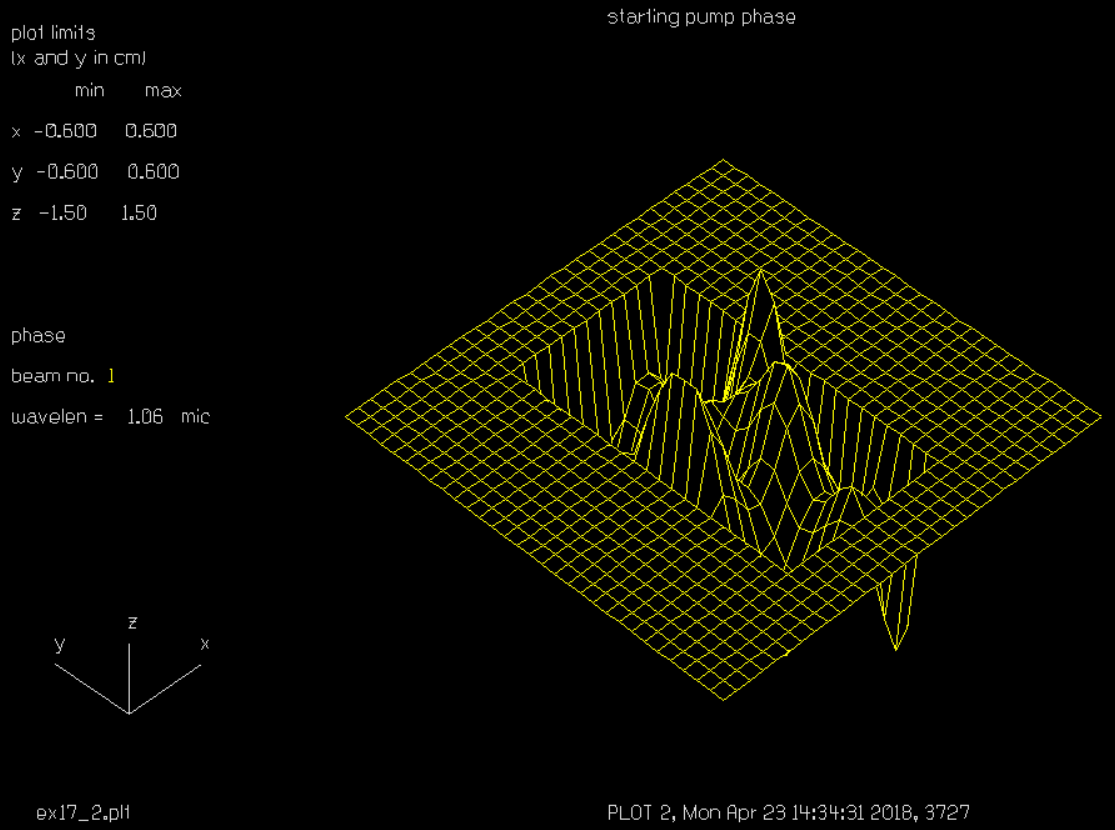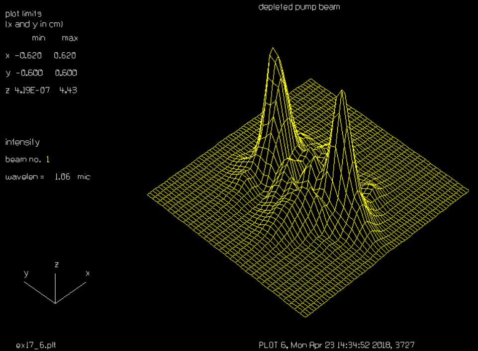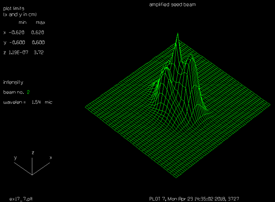 本例說明了通過一束更短的泵浦光對種子光進行拉曼放大的過程。泵浦光波長為1.06u,種子光的波長是1.54u。泵浦光和種子光都有畸變,種子光穿過一個空間濾波器,去除其他光束的干擾。種子光和泵浦光結(jié)合后穿過一個拉曼增益器,放大器衰減泵浦光同時將種子光放大。在這個模型中,泵浦光的任何相位都沒有附加到種子光上。泵浦光和種子光的光強分布反映了光闌邊緣的衍射效應(yīng)以及光束中的偏差。增益后的種子光輸出經(jīng)過圓柱透鏡聚焦成為一條線光源,可以用于非旋轉(zhuǎn)對稱的光學(xué)元件和矩形陣列。值得注意的是,軟件中的編碼自動選擇了矩陣單位的大小從而在兩個方向上都能得到很好的分辨率。