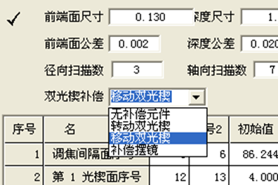為實(shí)現(xiàn)雙光楔一維線性掃描系統(tǒng)自動(dòng)設(shè)計(jì),可以在主窗口界面環(huán)境下利用“編輯”中的“系統(tǒng)基本數(shù)據(jù)”菜單窗體內(nèi)選擇“掃描系統(tǒng)”的“雙光楔掃描方式”出現(xiàn)設(shè)計(jì)窗體如圖1。