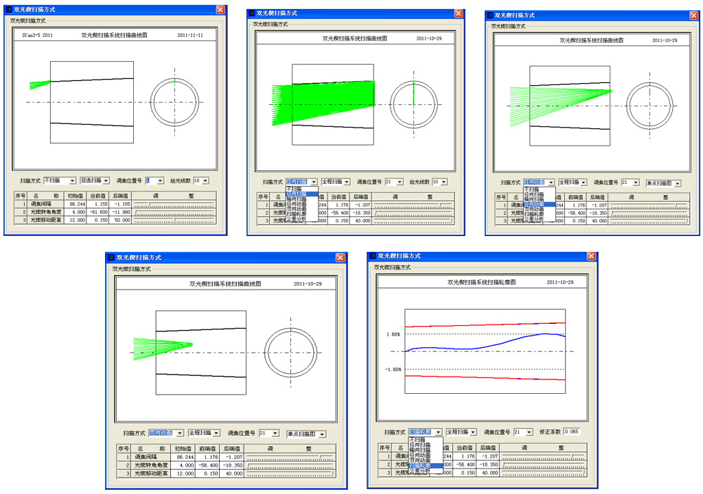 由于雙光楔三維立體深度掃描系統(tǒng)設(shè)計(jì)時(shí)變量因素較多,而且各自影響又比較獨(dú)立,因此采用手工調(diào)節(jié)的方法比較直觀有效,設(shè)計(jì)時(shí)只要在如圖8填寫完有關(guān)參數(shù)之后點(diǎn)擊“確定”按鈕即可出現(xiàn)一幅新的設(shè)計(jì)畫面如圖9。利用每行數(shù)據(jù)右側(cè)滾動(dòng)條即可隨意修改相應(yīng)參數(shù)幷在上方圖形中及時(shí)動(dòng)態(tài)觀察掃描光線變化情況以確定滿足要求的設(shè)計(jì)參數(shù)值。為觀察設(shè)計(jì)效果,可以利用圖10下方所示 “掃描方式”下拉式菜單觀察設(shè)計(jì)中的各種信息,其中擴(kuò)掃描光線的各種掃描效果、掃描輪廓圖形、圖形誤差以及掃描輪廓誤差及公差分析等,如圖9、圖10、圖11及圖12所示。