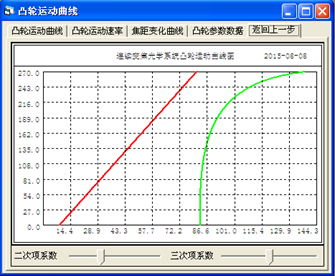 在選擇“曲線運(yùn)動(dòng)軌跡”后,界面下方會(huì)給出運(yùn)動(dòng)曲線方程系數(shù)的表格,可以直接填寫(xiě)。如果選擇“復(fù)合曲線軌跡”,界面上除顯示運(yùn)動(dòng)曲線方程系數(shù)的表格框外,還顯示“結(jié)合點(diǎn)位置”系數(shù),以便根據(jù)需要選擇合適直線與曲線結(jié)合點(diǎn)的位置,無(wú)論選擇以上哪種,都還可以利用拉桿條之間控制凸輪運(yùn)動(dòng)曲線或運(yùn)動(dòng)速率軌跡曲線。也可以先預(yù)設(shè)初步曲線方程系數(shù),然后通過(guò)拉桿條調(diào)整。在選擇“曲線運(yùn)動(dòng)軌跡”后,按“確定”鍵出現(xiàn)圖3界面。