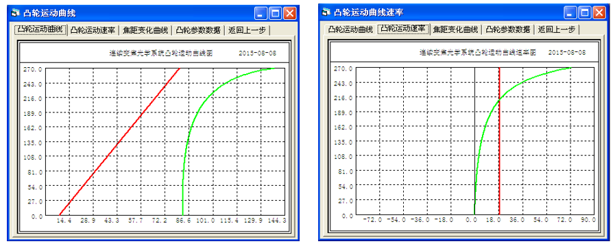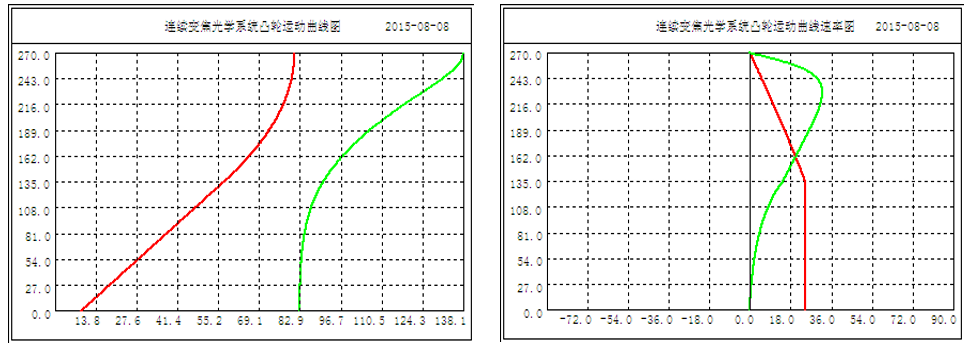 一般情況下,設(shè)計(jì)凸輪曲線時(shí)會(huì)把固定組后的變焦組的運(yùn)動(dòng)規(guī)律設(shè)計(jì)成直線,減少加工成本,但這是可能會(huì)帶來(lái)補(bǔ)償組的運(yùn)動(dòng)曲線過(guò)于彎曲,運(yùn)動(dòng)速率過(guò)大,甚至因運(yùn)動(dòng)速率過(guò)大以致影響凸輪運(yùn)轉(zhuǎn)過(guò)程中發(fā)澀甚至卡死。為了避免這一情況的發(fā)生,可以有意把變焦組曲線改成曲線緩解補(bǔ)償組的曲線陡度,以便有效改善凸輪曲線平滑運(yùn)行。