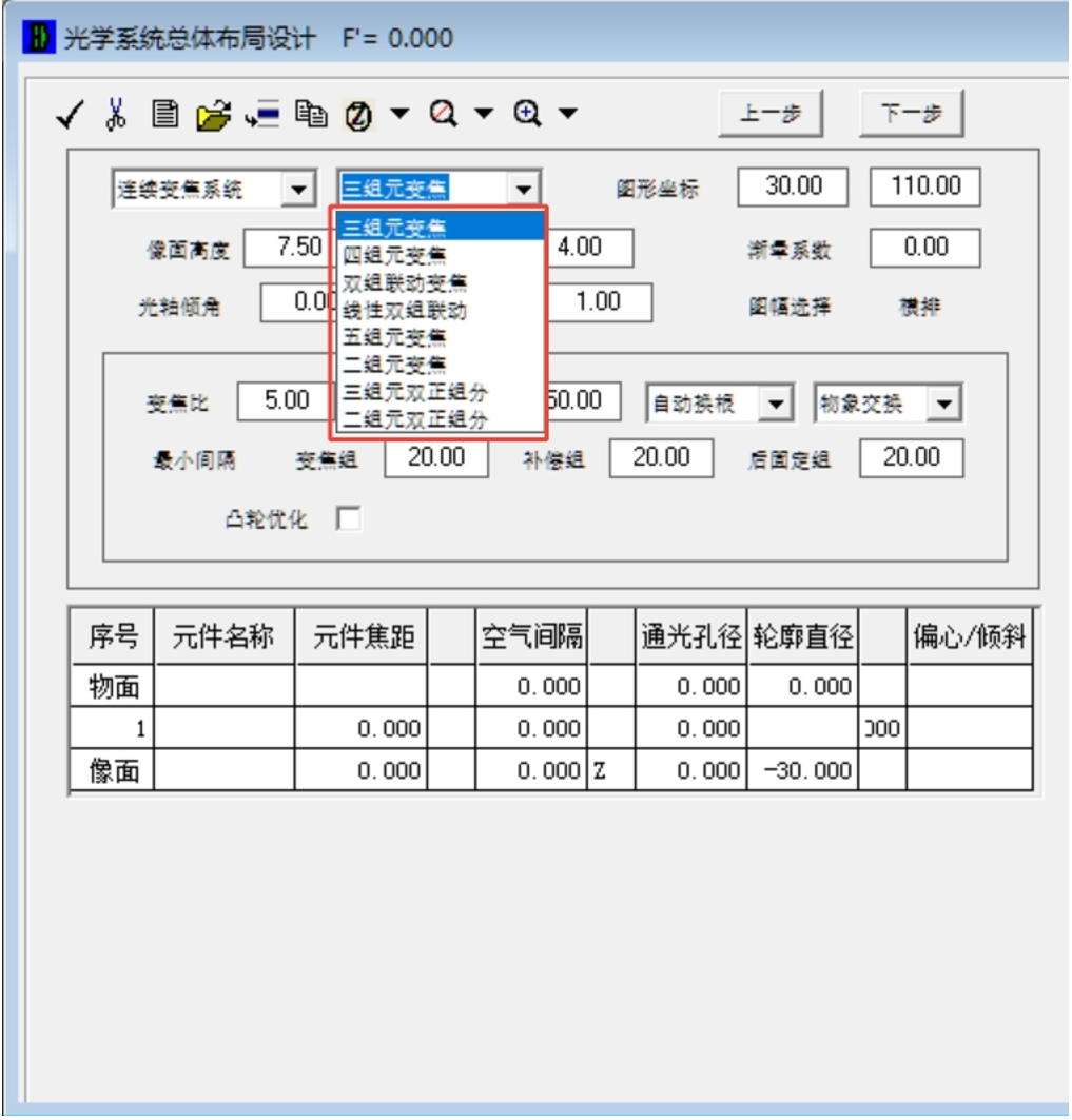 利用OCAD光學自動設計程序設計機械補償式連續(xù)變焦光學系統(tǒng)自動設計,在程序內(nèi)有兩個途徑,一個是在其“光學系統(tǒng)總體布局設計”的菜單內(nèi),另一個可在“機械補償光學系統(tǒng)設計”菜單內(nèi)完成。二者各有不同方式和功能進行處理。在“機械補償光學系統(tǒng)設計”菜單內(nèi)進行設計比較簡潔方便,使用“光學系統(tǒng)總體布局設計”菜單進行設計,是從系統(tǒng)總體布局角度,可以把系統(tǒng)設計得比較完善,可以在變焦系統(tǒng)的基礎上添加其他光學元件,比如轉(zhuǎn)像棱鏡,或者添加目鏡系統(tǒng)完成整個望遠系統(tǒng)的全局設計。