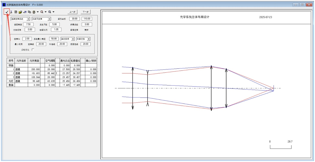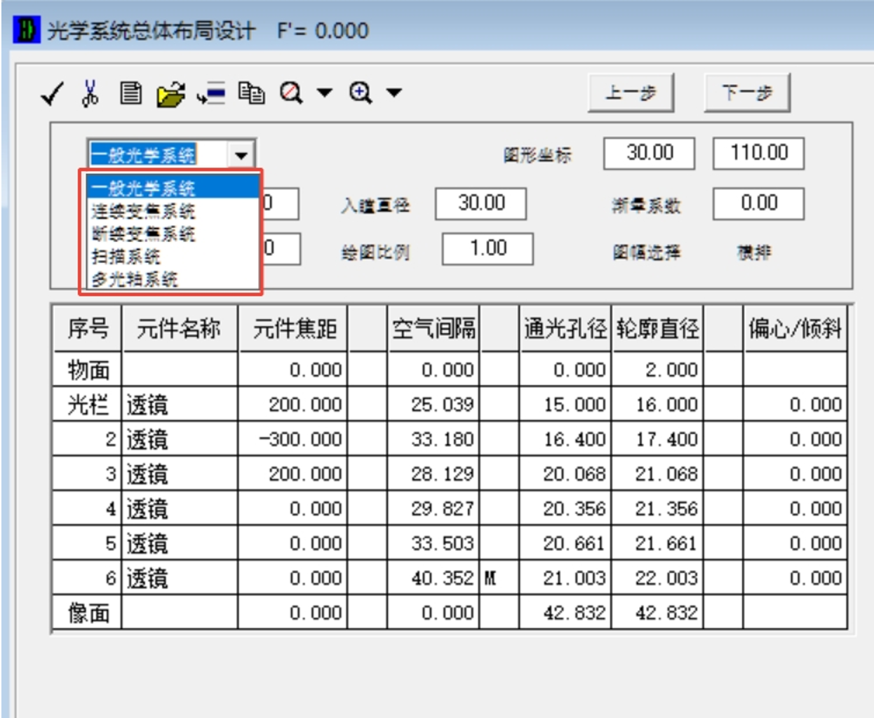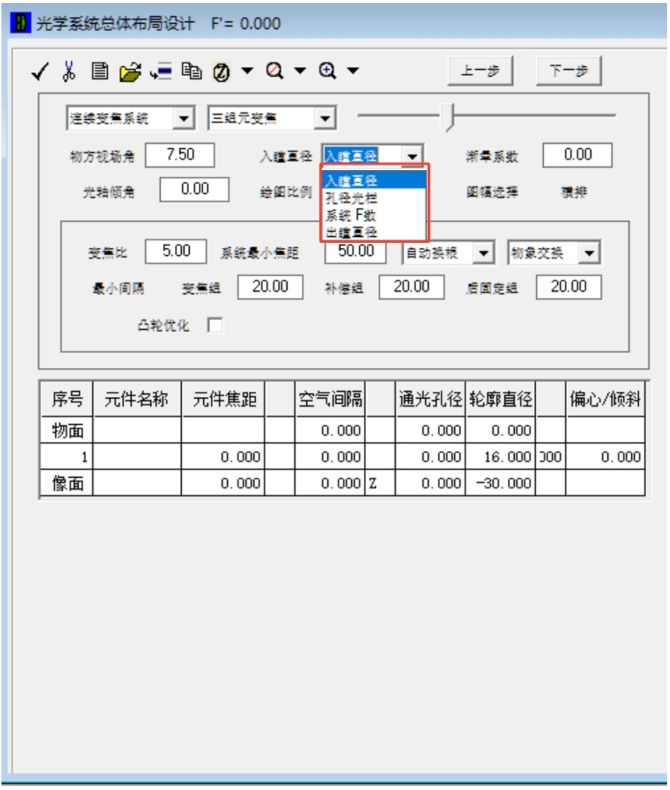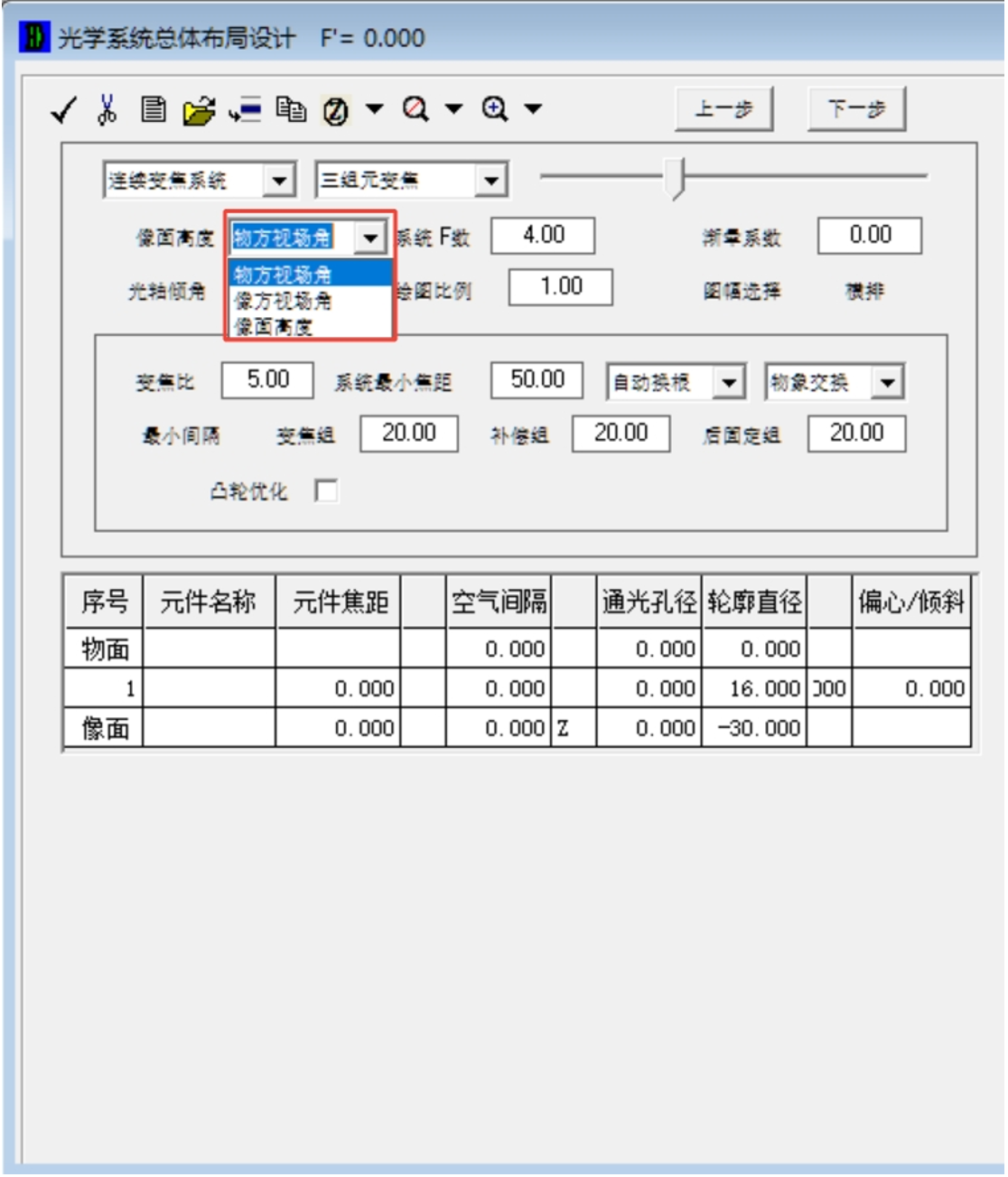 此外,界面上還會顯示連續(xù)變焦系統(tǒng)的可選方框。在此框內(nèi)可以根據(jù)設(shè)計要求填寫變焦系統(tǒng)的變焦比、系統(tǒng)最小間距以及各組分間最小間隔距離等。