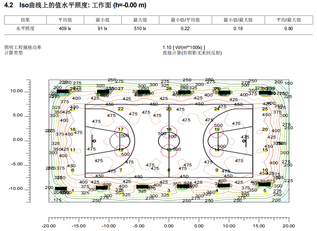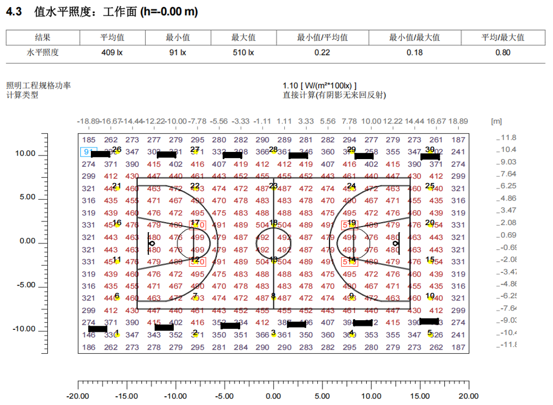 設計籃球場面積合理,其中布置燈具擺放合理,符合照明標準。